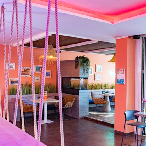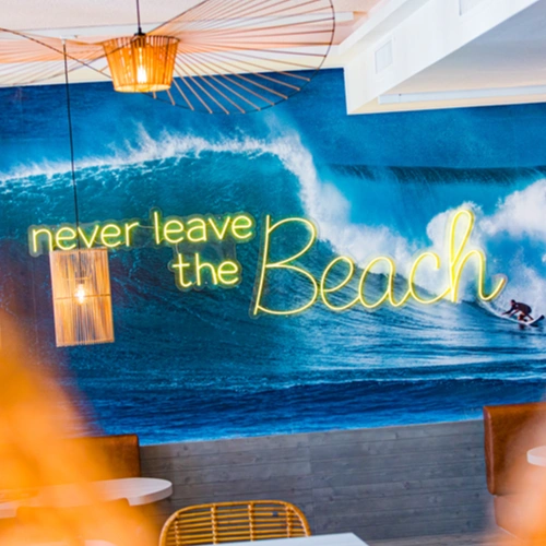 - Lifestyliges Store-Design: Alle Stores sind im Beach- & Surf-Stil gestaltet: warme Farben, Holz, Surfboards, Lichtakzente, gemütliche Sitzecken und eine zentrale Bar.